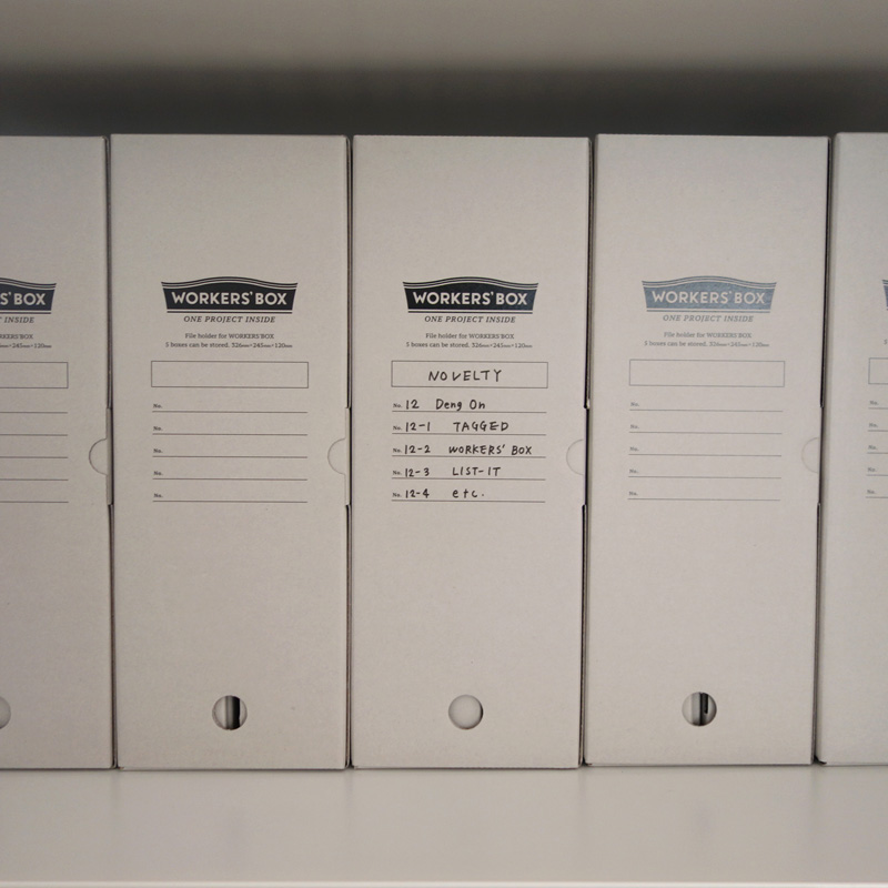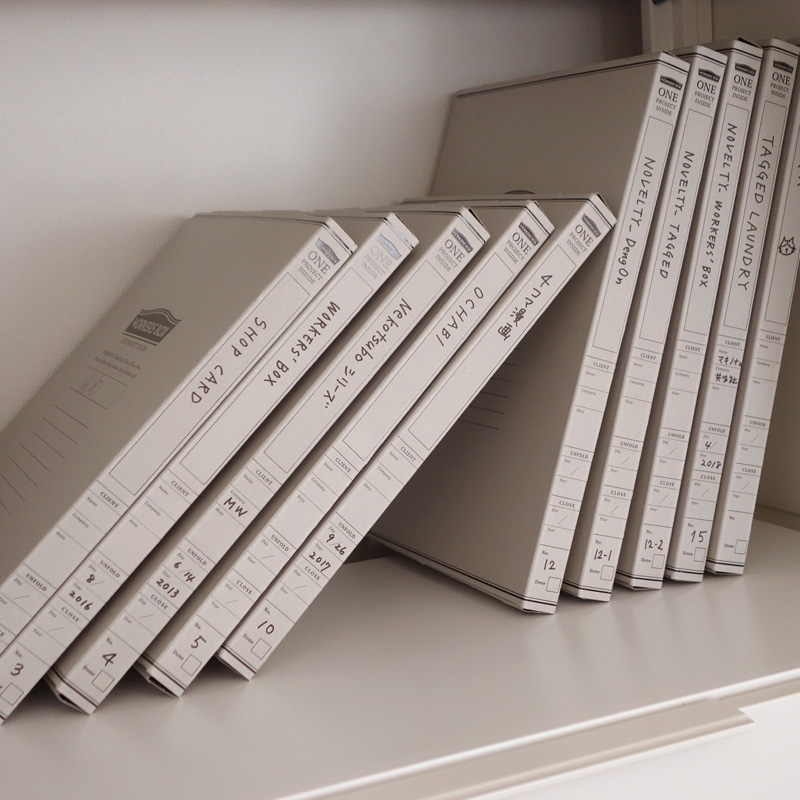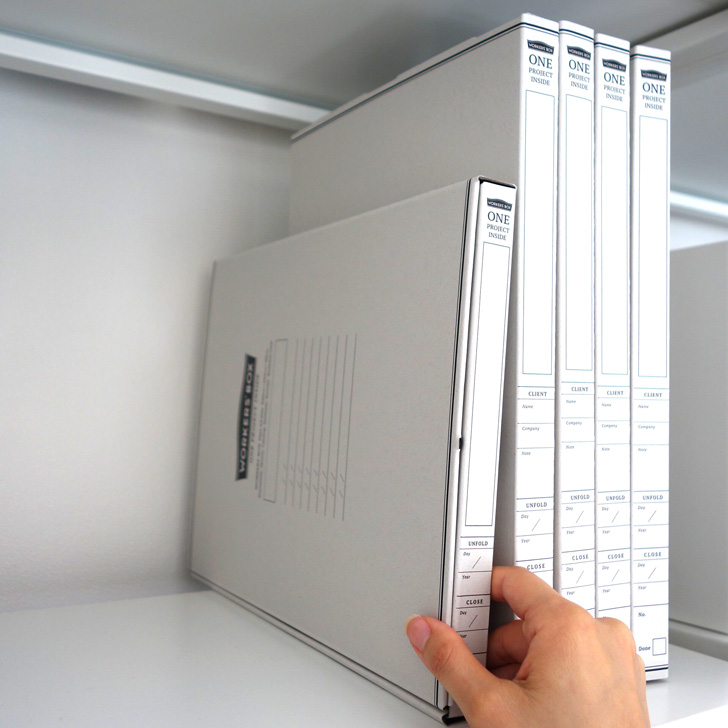 「WORKERS’BOX」は背表紙と底の2か所にインデックスを設けていまして、書棚の高さに合わせてタテにもヨコにも置けるようにデザインしています。
