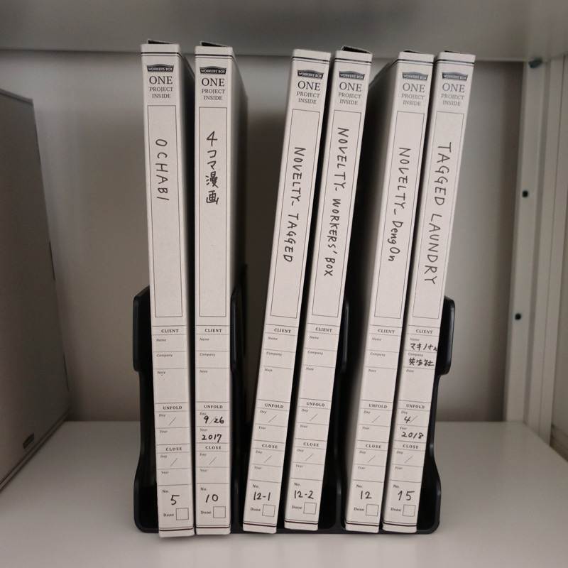 これまではフォルダと連動させたBOXの連番で並べていたのですが、仕事が舞い込むごとに増えていくので、書類のジャンルがとびとびでどこかスッキリしませんでした。