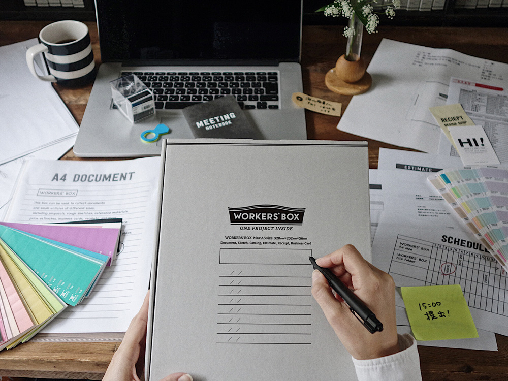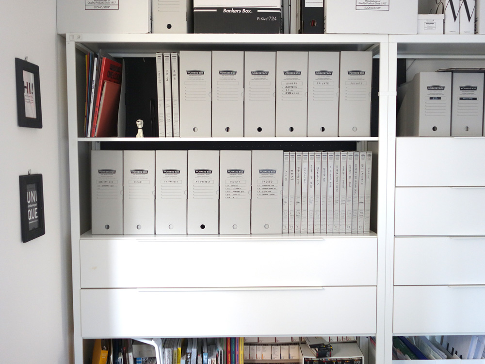 ハイモジモジ松田ほら、お仕事の書類はプロジェクトごとに、ぜーんぶ「WORKERS’BOX」にまとめてあるよ。めっちゃスッキリ。